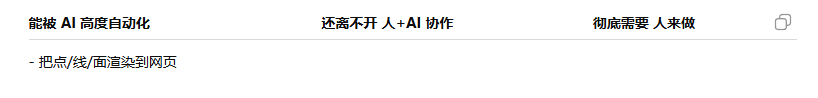 图 我问AI你会替代哪些东西,然后他列了个表,不会替代的那两栏是空的